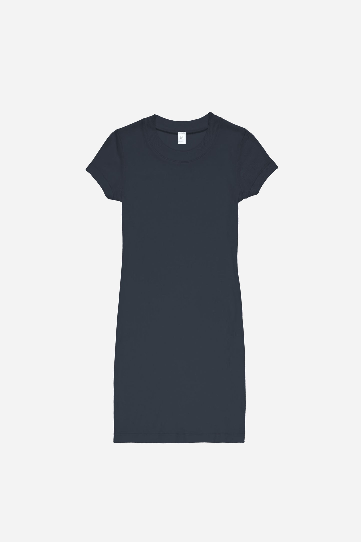 Form-fitting ribbed mini dress with a crew neck, short sleeves and heavy hems.